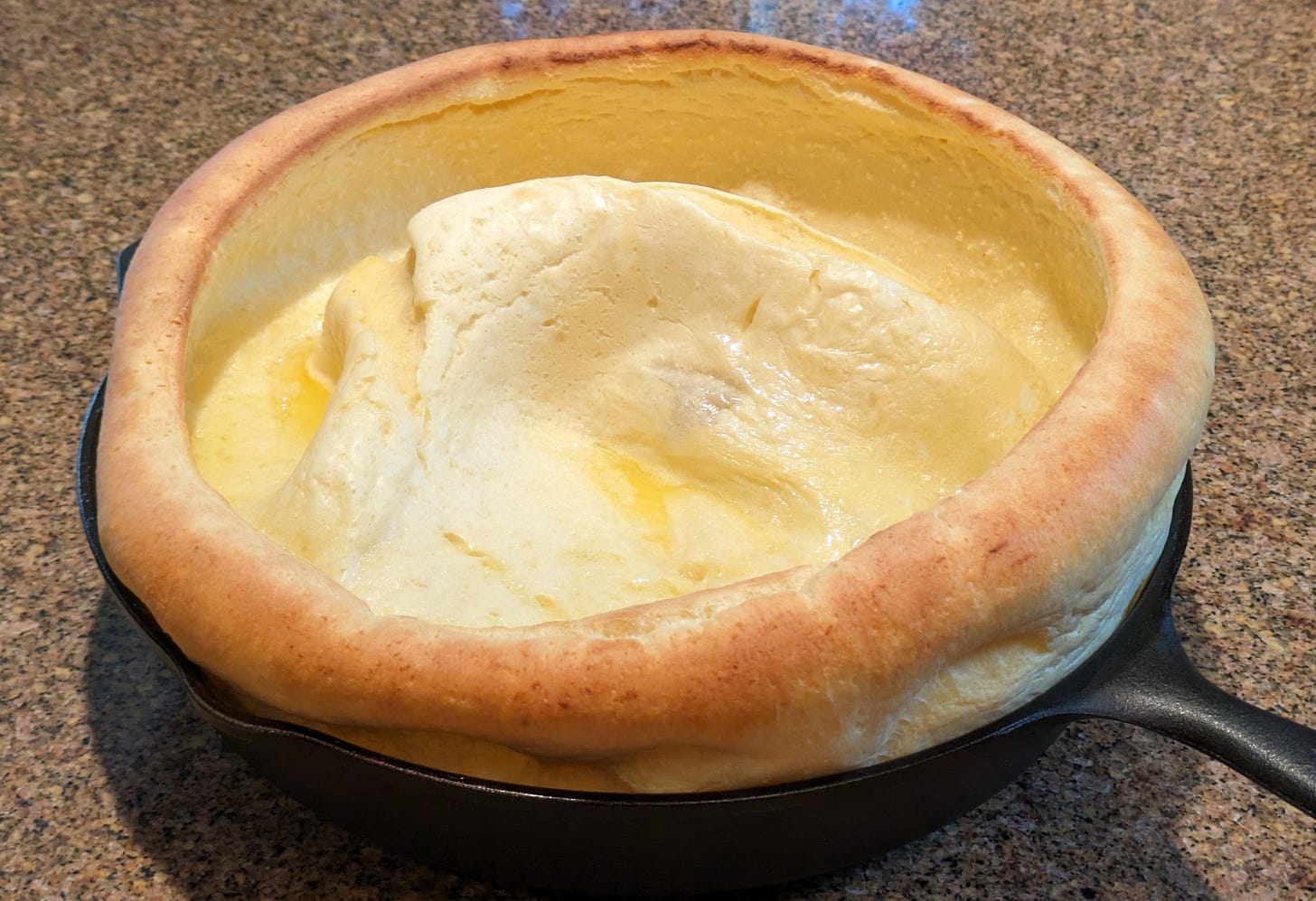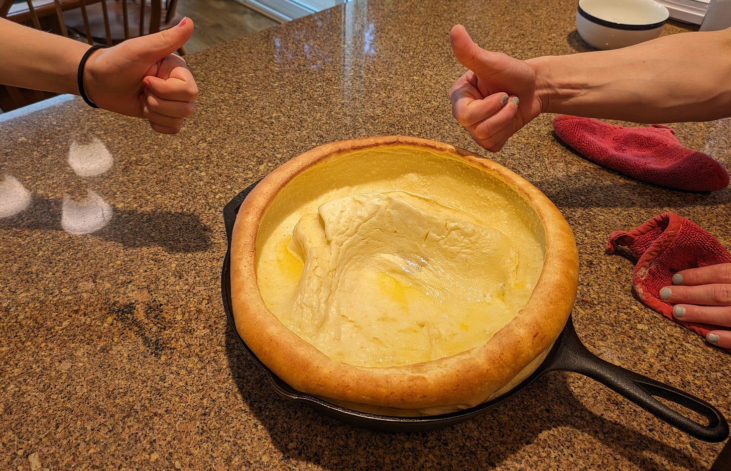 This is the most exciting thing I make for breakfast. When I’m about to pull it out of the oven I yell out that it’s done and everyone gathers in the kitchen for the reveal. How high has it has puffed this time? It never disappoints.