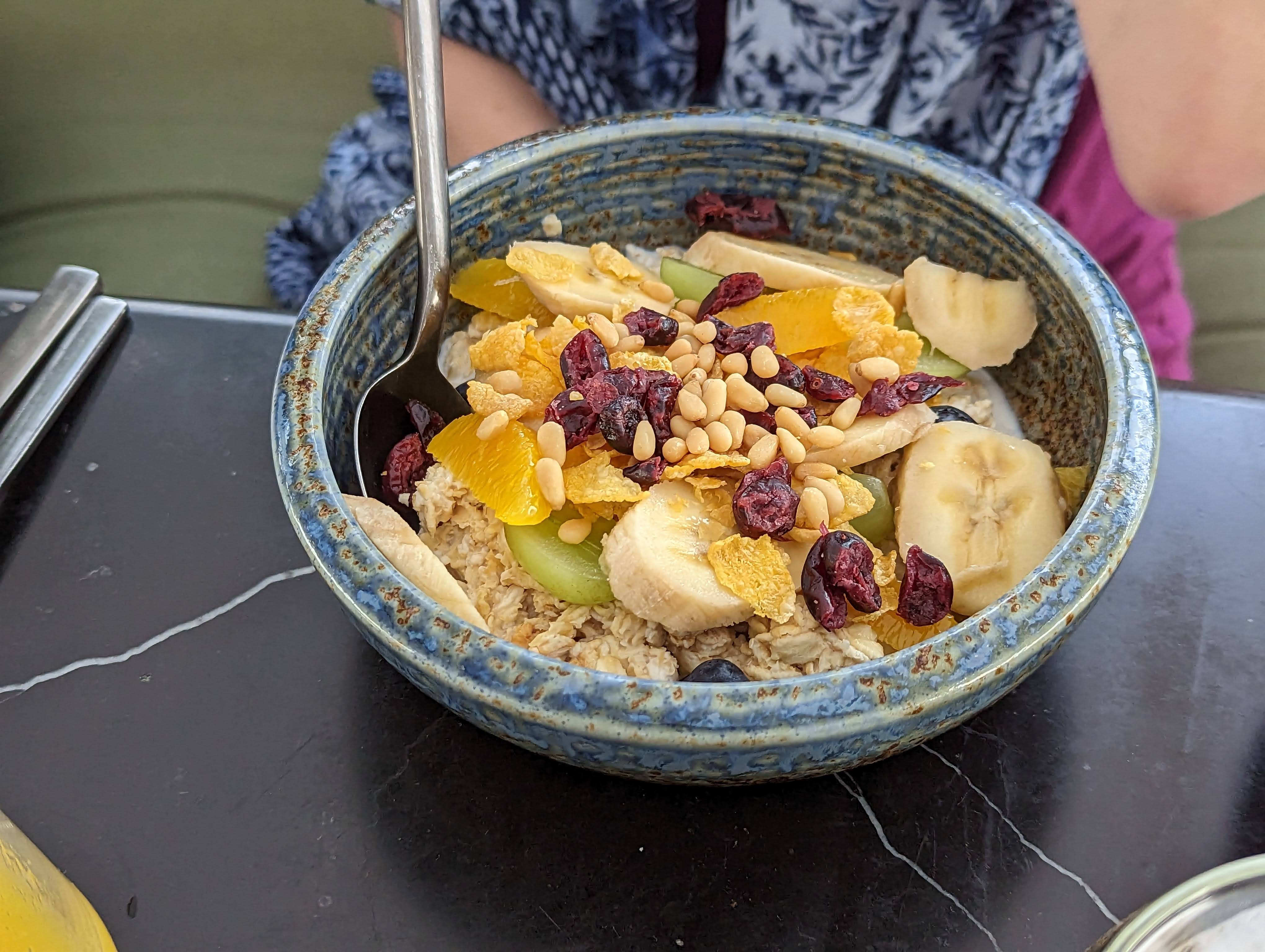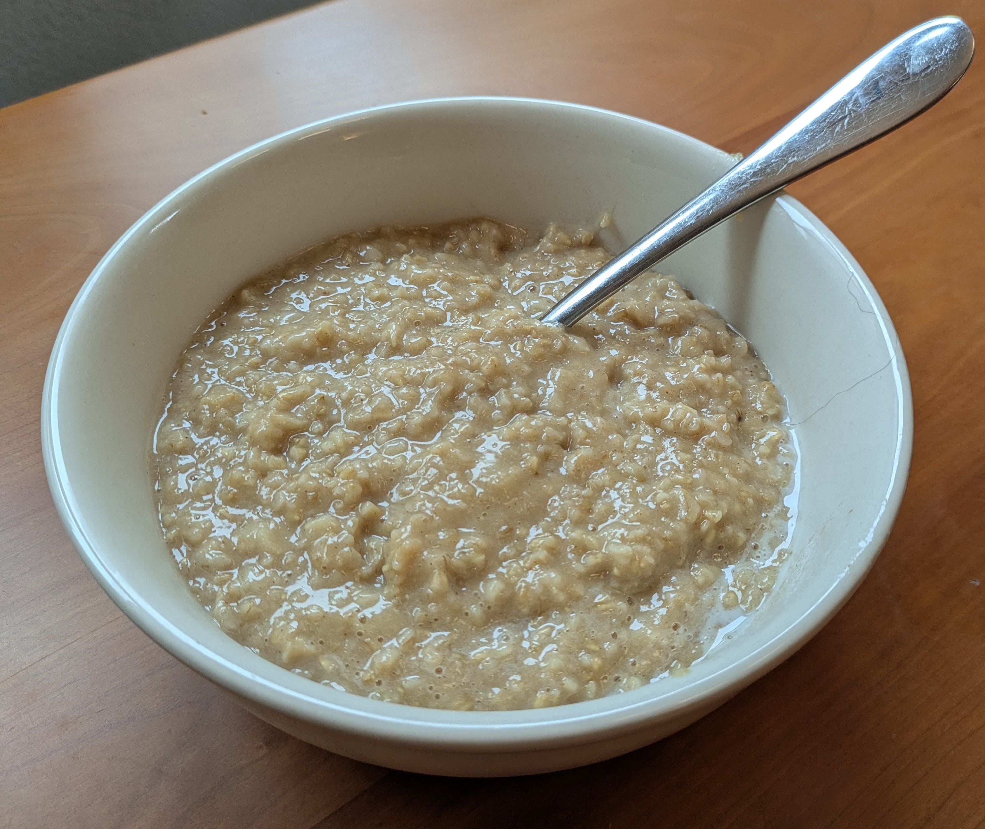 I eat oatmeal whenever we travel to get new ideas: Indonesia (star anise), Taiwan (pine nuts and corn flakes), Japan (dashi and soy sauce), Costa Rica (honey and banana), London (ask for porridge). This is my base recipe, with some variations to keep it spicy.