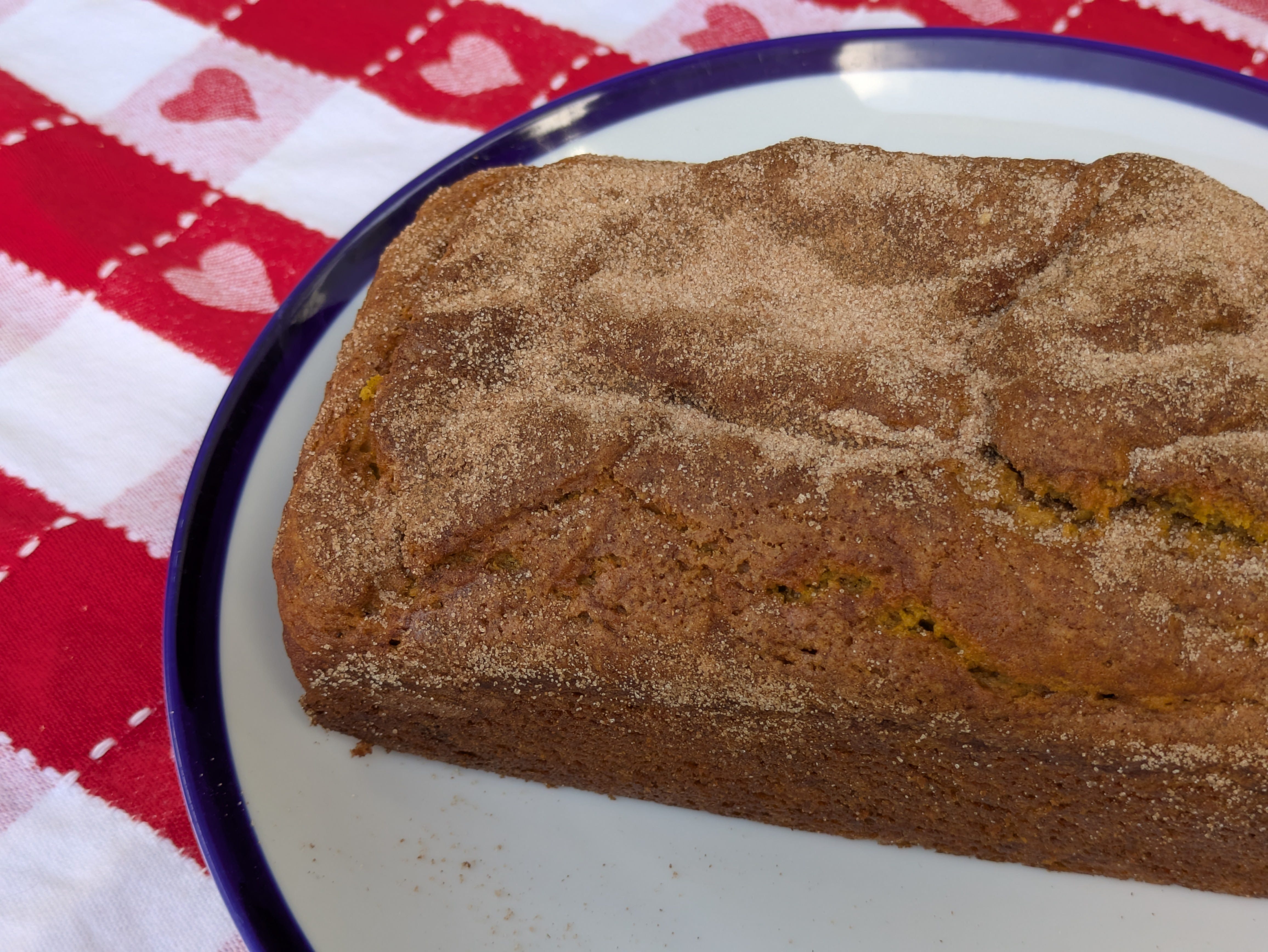 For Bread 1 15-ounce can (1 3/4 cups) pumpkin puree 1/2 cup melted butter (115 grams) 3 large eggs 1 2/3 (330 grams) cups granulated sugar 1 1/2 teaspoons baking powder 3/4 teaspoon baking soda 3/4 teaspoon fine sea or table salt 3/4 teaspoon ground cinnamon Heaped 1/4 teaspoon fresh grated nutmeg Heaped 1/4 teaspoon ground ginger Two pinches of ground cloves 2 1/4 cups (295 grams) all-purpose flour To Finish 1 tablespoon (12 grams) granulated sugar 1 teaspoon ground cinnamon