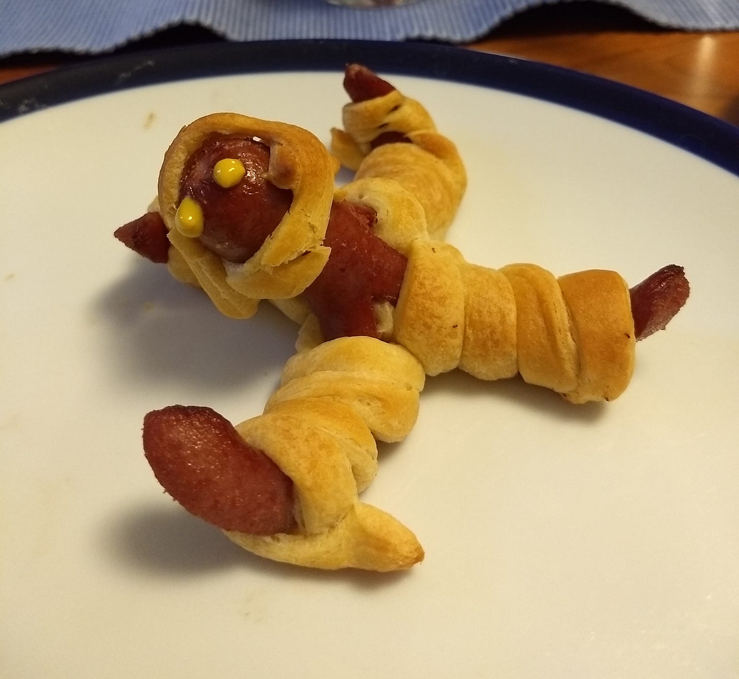 Cheese hot dogs wrapped in crescent rolls, made to look like mummies: I did this for a few years when my daughter was young. We are all glad that she is grown up and these no longer make an appearance at the table.