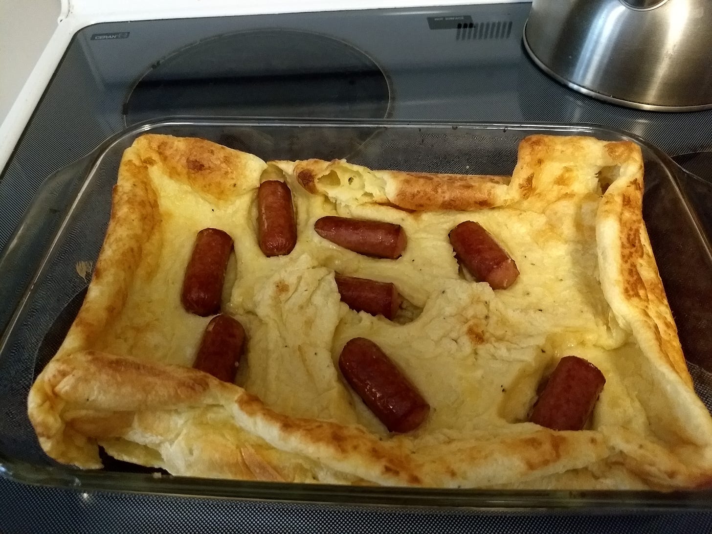 Toad-in -a-hole: Sausages cooked in Yorkshire pudding. It sounds delicious, but it was not. It looked obscenely awful and tasted worse. Never again, unless I find myself in an authentic British pub where they know what they are doing.